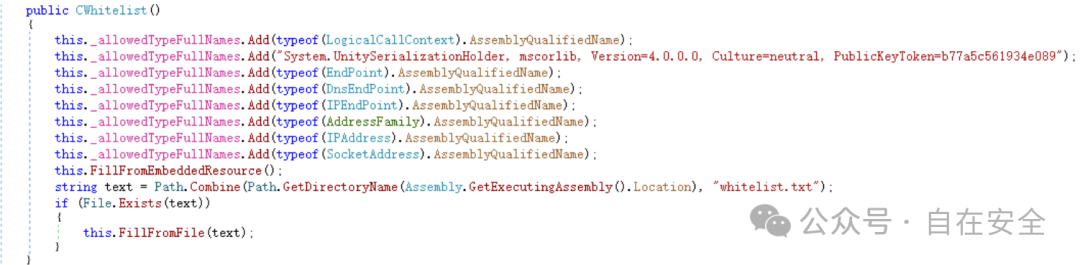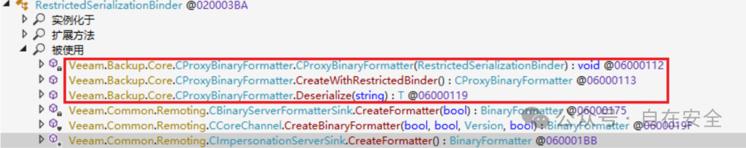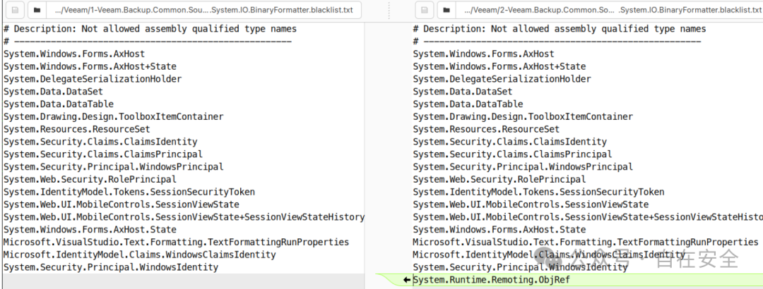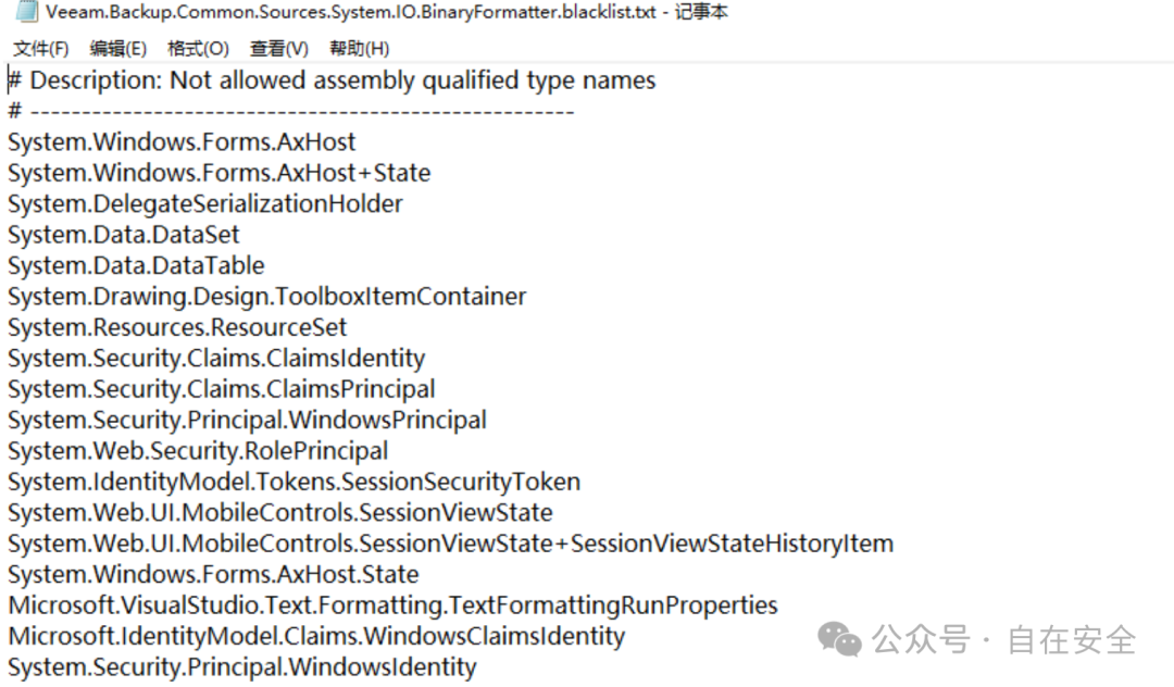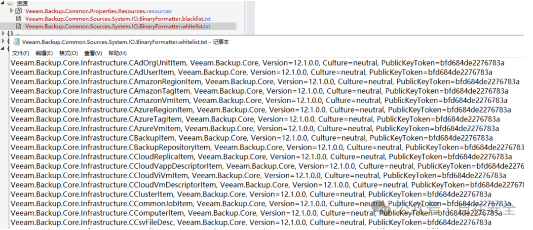 既然启用了白名单,那么只能尝试在合法的类型中寻找可利用对象。同时 Veeam 中还定义了黑名单(定义在 CBlacklist 类中,黑名单位于 blacklist.txt),只不过在 CBinaryServerFormatterSinkProvider 中没有用到黑名单:
