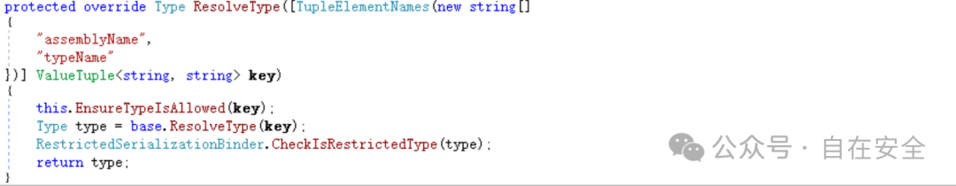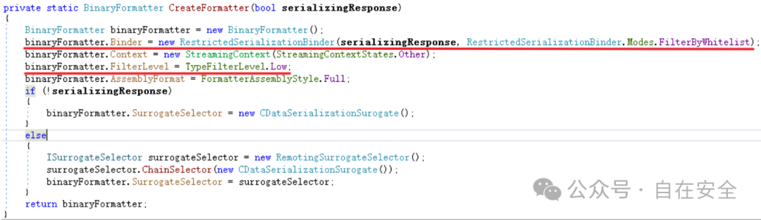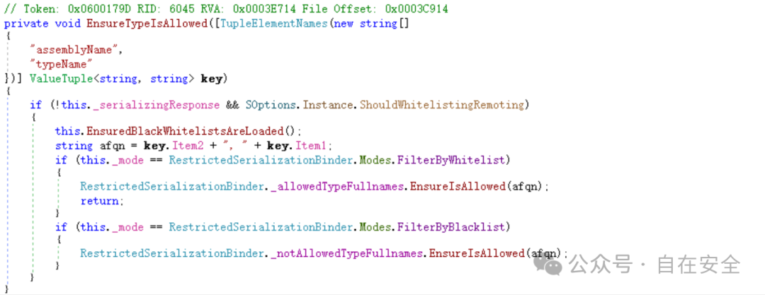 函数中不仅限定了 TypeFilterLevel 为 Low ,还针对 BinaryFormatter 反序列化类型调用 RestrictedSerializationBinder 进行黑白名单检查,这里 mode 取值为 FilterByWhitelist ,对应白名单检查: