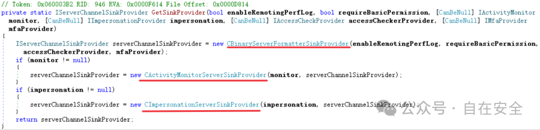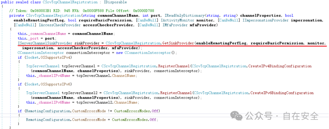 CSrvTcpChannelRegistration 构造函数中完成了 TcpServerChannel 注册,并通过 CSrvTcpChannelRegistration.GetSinkProvider 函数实例化了 IServerChannelSinkProvider 类型:
