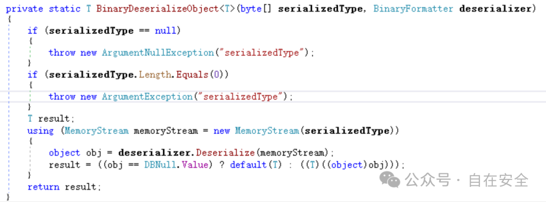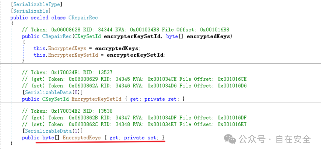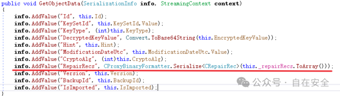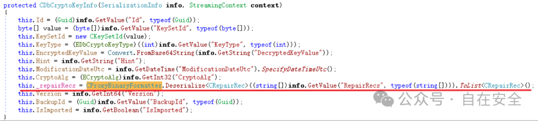 关注其中的 CDbCryptoKeyInfo 类,该类继承了 ISerializable 接口, BinaryFormatter 反序列化时会自动调用构造函数,在序列化时将调用 GetObjectData 函数: