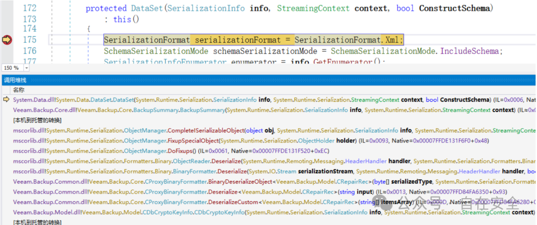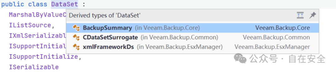 ObjRef 加入了黑名单,如果能够找到新的 gadget ,那么就能够再次 RCE。BinaryFormatter 存在很多公开的 gadget ,比如 TextFormattingRunProperties 或者 DataSet 等等,但是这些 gadget 早就被加入了黑名单。可以尝试在 Veem 自生类中寻找继承了这些类的子类。搜索找到 3 个继承 DataSet 的类: xmlFrameworkDs 、 BackupSummary 和 CDataSetSurrogate ,
