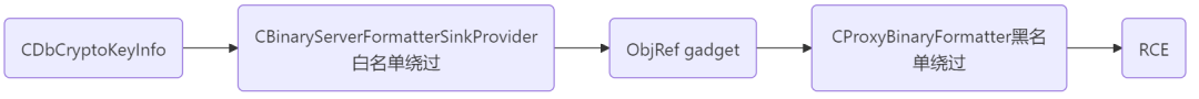 这里通过 .NET 泛型类型定义的方式将反序列化对象限定为 CRepairRec 类,注意到 CRepairRec 类中存在一个名为 EncryptedKeys 的字节数组,正好可以将反序列化的 gadget 放入其中,这样在 CBinaryServerFormatterSinkProvider 反序列化检查白名单时,CDbCryptoKeyInfo 对象可以绕过,同时在其构造函数中会触发 CRepairRec 对象的二次反序列化,结合 ObjRef 链可以绕过黑名单: