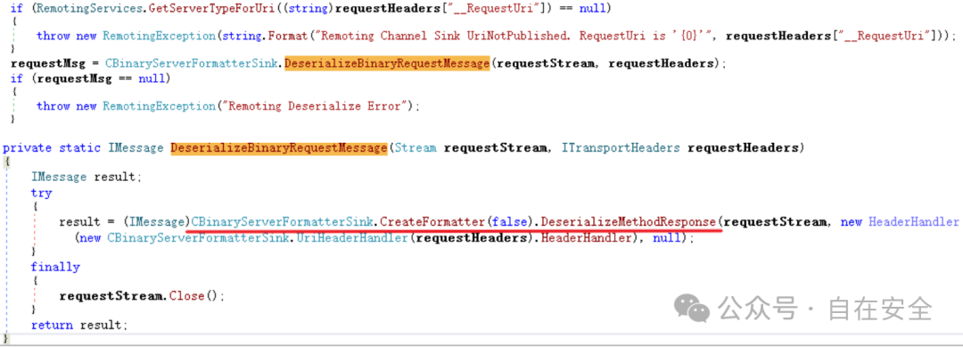 重点关注其中的 CBinaryServerFormatterSinkProvider ,对应的 Sink 为 CBinaryServerFormatterSink 类型,反序列化操作通过 ProcessMessage 来完成,该函数与 .NET Framework 自带的 BinaryServerFormatterSink 类似,反序列化函数为 DeserializeBinaryRequestMessage :