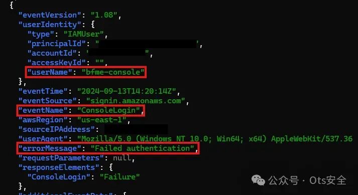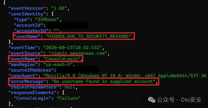 此处披露的两种攻击都会在 CloudTrail 中生成“ ConsoleLogin ”事件,一个事件带有错误消息“在提供的帐户中未找到用户名”,另一个事件带有“身份验证失败”(当用户名有效但 mfa 或密码不正确时)。下面的屏幕截图提供了每个事件的完整 Cloudtrail 日志(左:无效的 IAM 用户名,右:有效用户名但身份验证失败)。