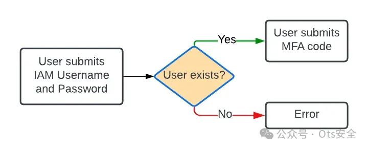 当为 IAM 用户帐户启用 MFA 时,登录流程会泄露用户的存在。下面的流程图显示了登录流程的用户体验。提交凭证后,会出现一个分叉,在 UI 中产生两个完全不同的应用程序状态。这不需要任何特殊工具来检测。