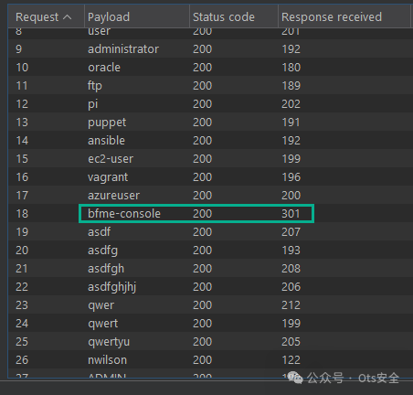 为了检查时间差异,我们在 AWS 账户中创建了一个测试 IAM 用户,用户名为“bfme-console”。该用户被授予控制台访问权限,并且禁用了 MFA。然后,我们使用了 Burp Suite 的 Intruder,没有并发(资源池 > 最大并发请求“1”)。下面是 Intruder 结果的图像。屏幕截图中的列是: