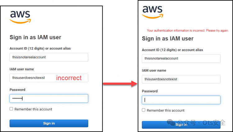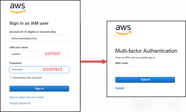 如果用户存在(无论密码是否正确),下一页都会请求 MFA 代码(顶部图片),确认 AWS 中的 IAM 用户。