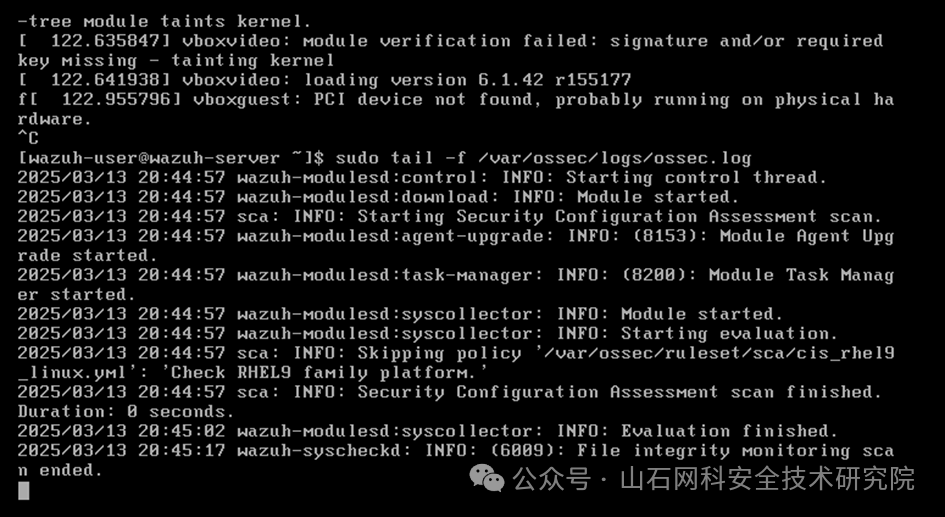 输入sudo tail -f /var/ossec/logs/ossec.log来对日志进行监控,如下图所示。