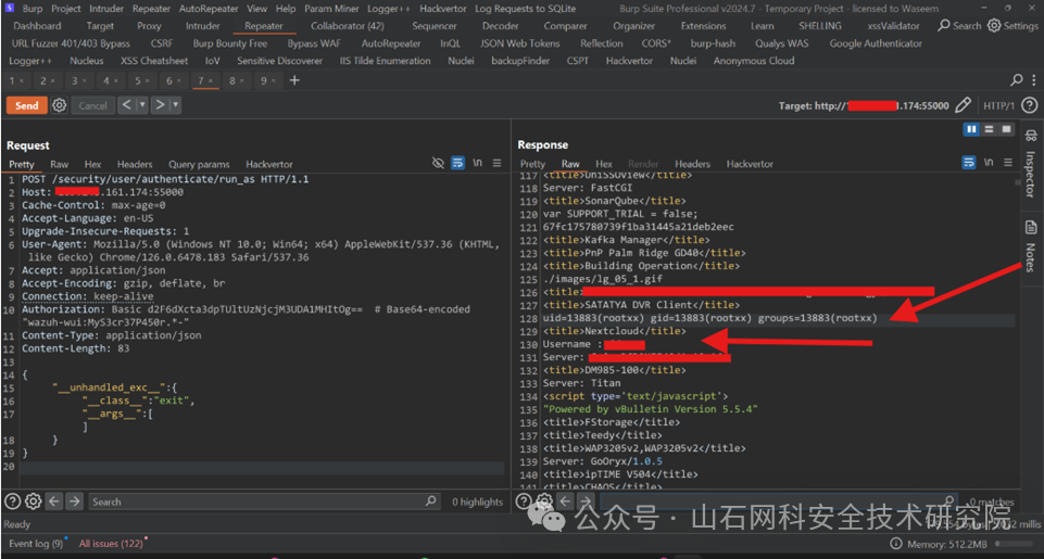 攻击者向https://:55000/security/user/authenticate/run_as发送伪造身份认证的POST请求,绕过SSL证书验证(-k参数),使用默认凭证(如wazuh-wui账户)通过基础认证(-u参数),通过构造特殊的JSON数据{“unhandled_exc”:…}触发API接口的反序列化漏洞,使服务器错误解析为系统级exit命令,最终导致主服务进程强制终止。