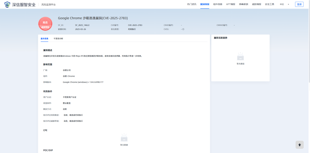 2025年3月26日,深瞳漏洞实验室监测到一则Google Chrome组件存在沙箱逃逸漏洞的信息,漏洞编号:CVE-2025-2783,漏洞威胁等级:高危。