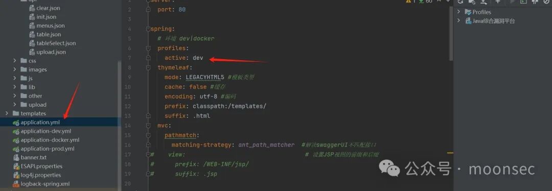 使用idea打开项目文件   编辑 application.yml docker改成dev