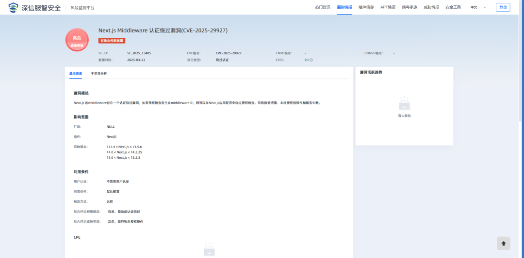 2025年3月24日,深瞳漏洞实验室监测到一则NextJS组件存在绕过认证漏洞的信息,漏洞编号:CVE-2025-29927,漏洞威胁等级:高危。