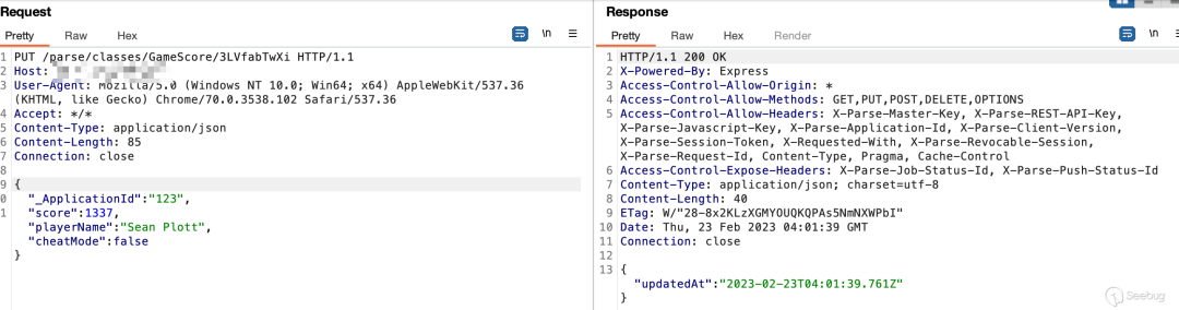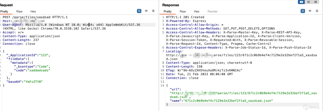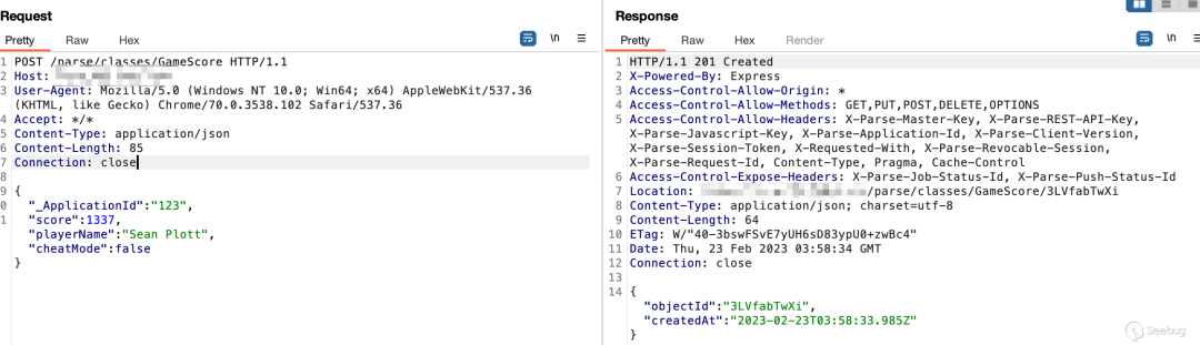 GET /parse/hooks/functions/f34 HTTP/1.1Host: ip:portUser-Agent: Mozilla/5.0 (Windows NT 10.0; Win64; x64) AppleWebKit/537.36 (KHTML, like Gecko) Chrome/70.0.3538.102 Safari/537.36Accept: */*Content-Length: 52Content-Type: application/jsonConnection: close{"_ApplicationId":"123","_MasterKey":"123456"}