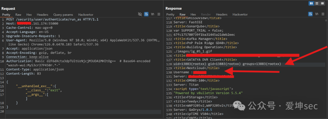 攻击者可以利用终端触发 RCE run_as,从而控制auth_context参数。通过构造恶意请求,可以在主服务器上执行任意代码。