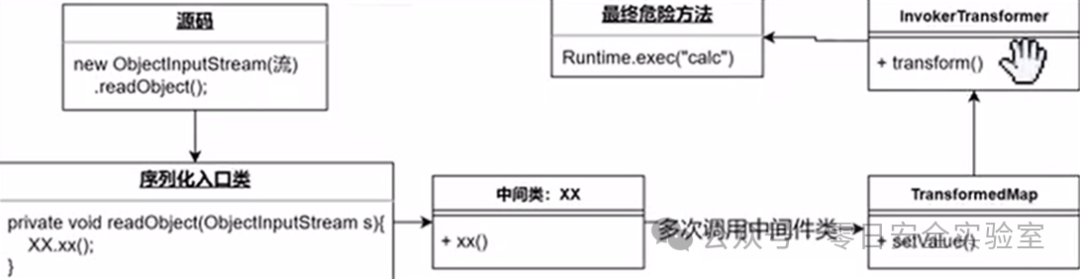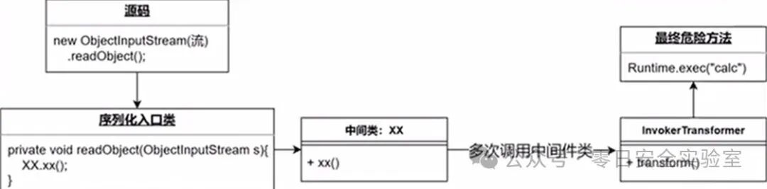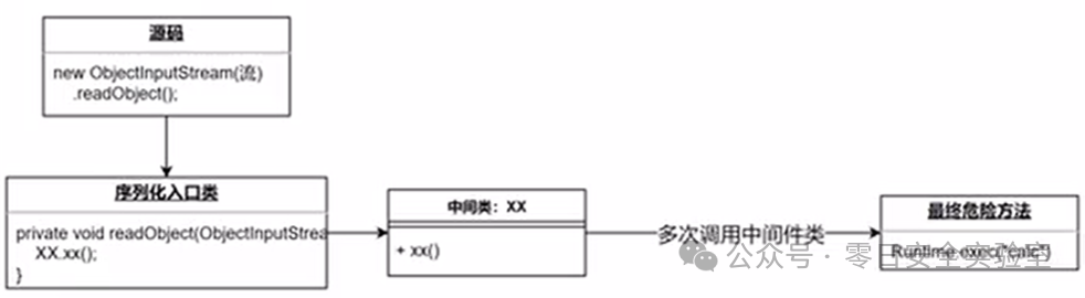 假设我们现在就是要执行这个危险方法,那么我们就可以往回找,看谁可以调用这个危险方法,然后谁又可以调用这个中间类。最终我们要找到序列化入口类,它重写了readObject方法,并且可以依次链式执行下去。