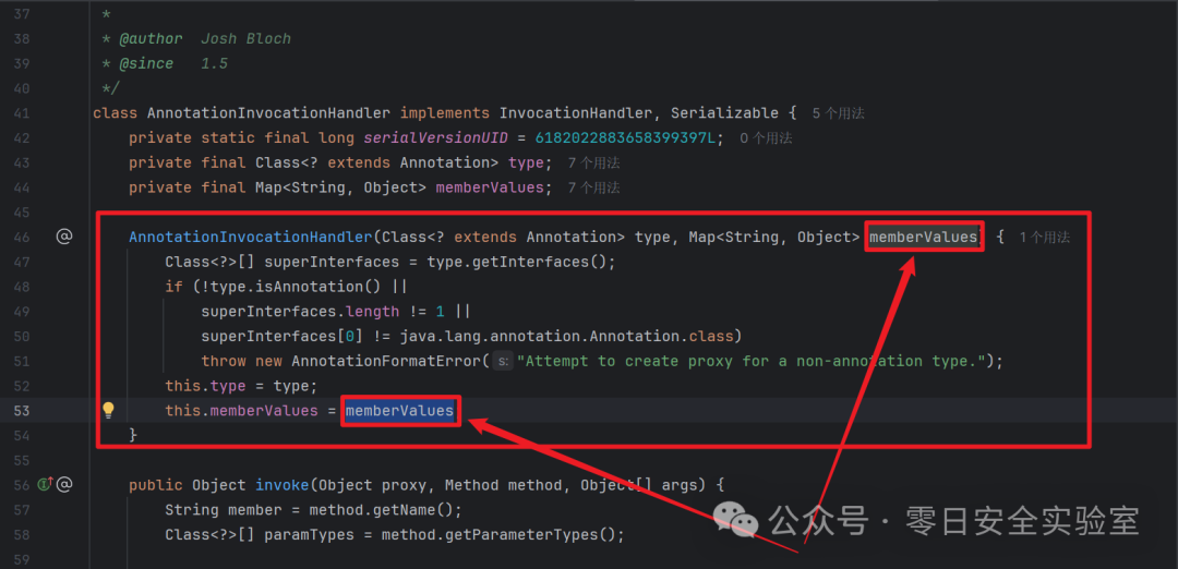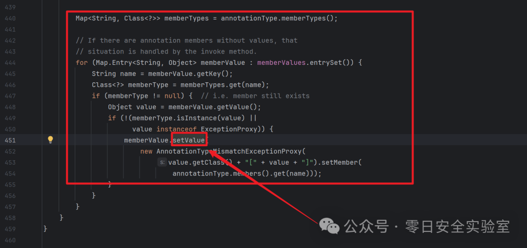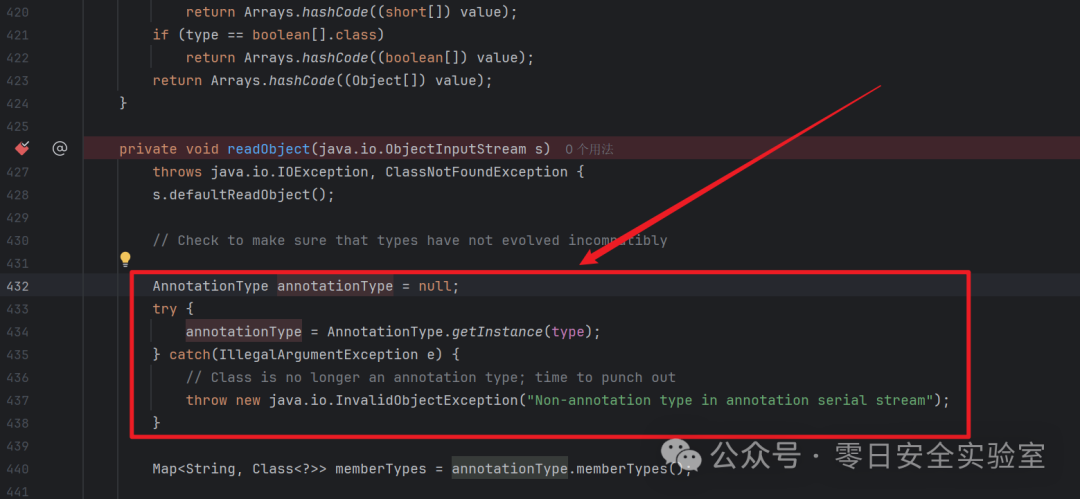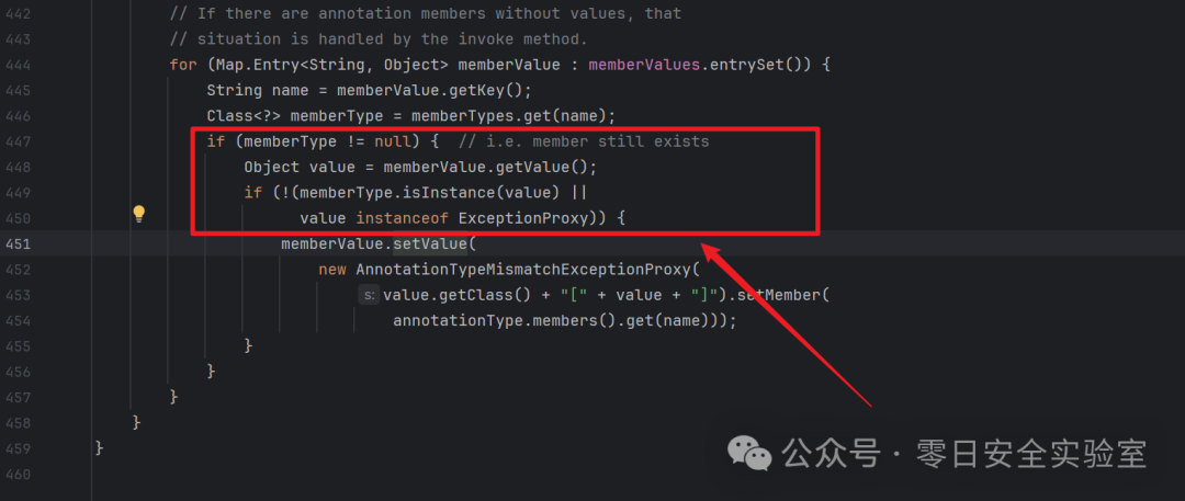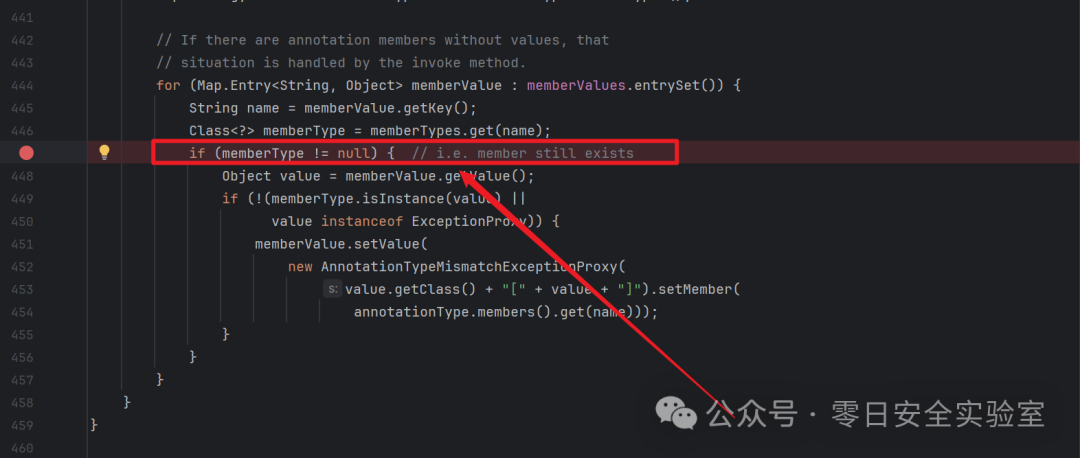 首先我们看第一层if后面的memberType != null,从Map<String, Class<?>> memberTypes = annotationType.memberTypes()可以看出memberType又是一个Map,从memberTypes.get(name)可以看出这个函数里面的参数不能为空,那我们是不是可以给它传入一个已经存在的key那就自然而然不可能为空了。