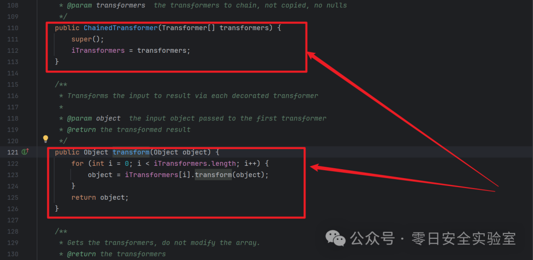 但是由于ChainedTransformer不管传入什么都返回的特性,你最终的ChainedTransformer.transformer传入什么都不重要了,链条也得以执行以至执行到我们的危险方法。