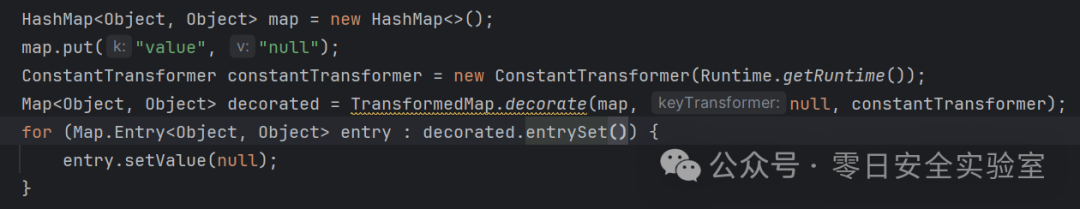 先构造一个我们自己的map,键和值都是Object,然后在这个map里面放入一些值,比如a,b。最后我们用TransformedMap对原始map做一个增强,keyTransformer为null,valueTransformer我们使用之前构造好的invokerTransformer对象,然后它就会返回一个Map,这个Map是增强过的,它的键和值我们仍旧都是Object。