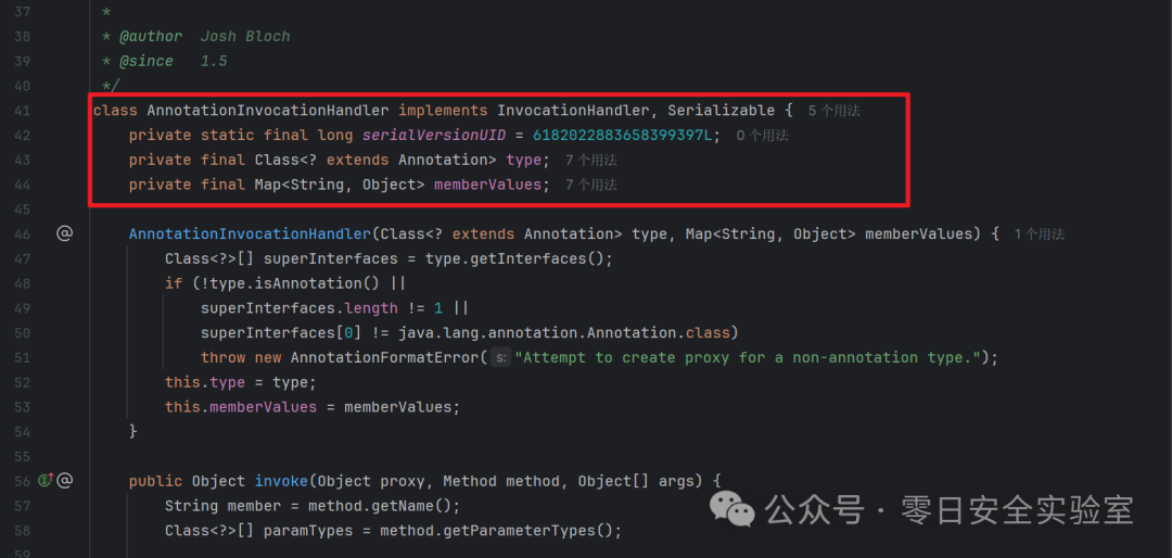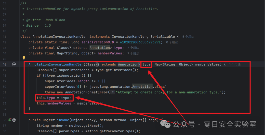不难发现在这里使用了这个注解Type(annotationType),从annotationType = AnnotationType.getlnstance(type)可以看出对其进行了实例化,从参数这里发现这个注解Type就是我们前面构造AnnotationlnvocationHandler方法的时候传进去的注解Type。如下图: