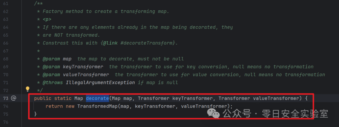 不难发现还有一个decorate装饰方法,可以将我们的valueTransformer变量传入,然后再调用TransformedMap方法。这里的decorate装饰方法是一个公开静态的方法,它会给你进行实例化。