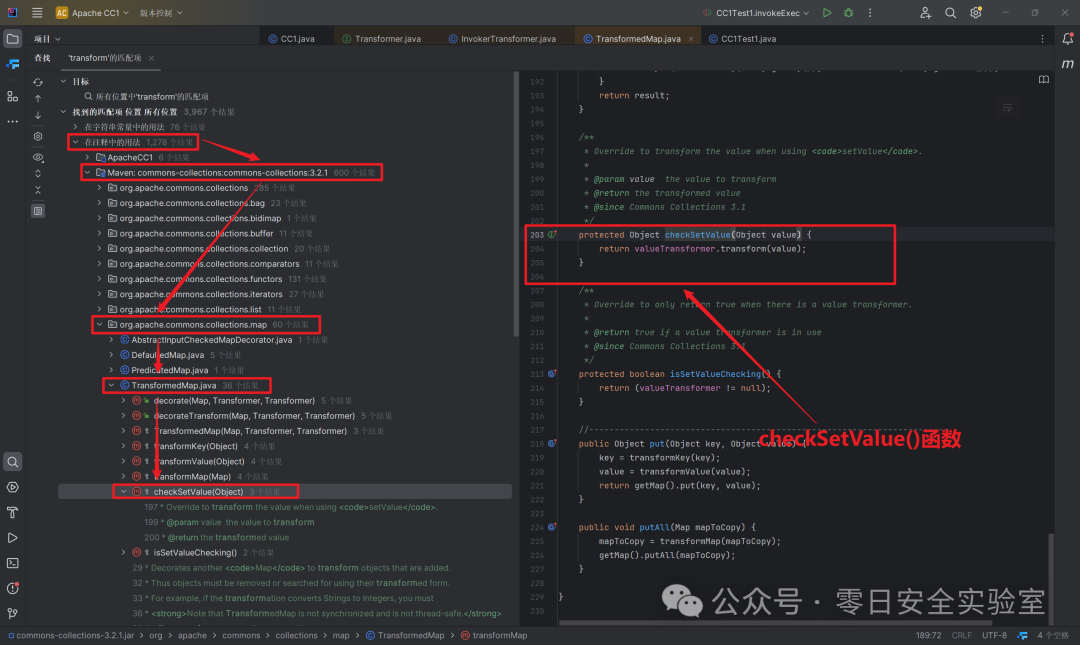 不难发现在TransformedMap类中checkSetValue()函数这里调用了Transformer方法。