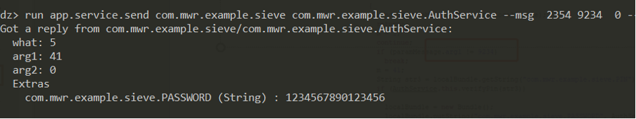 run app.service.send com.mwr.example.sieve com.mwr.example.sieve.AuthService –msg2354 9234 0 –extra string com.mwr.example.sieve.PIN 1111 –bundle-as-obj