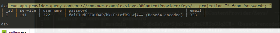 run app.provider.query content://com.mwr.example.sieve.DBContentProvider/Keys/ –projection “* from Passwords;-”