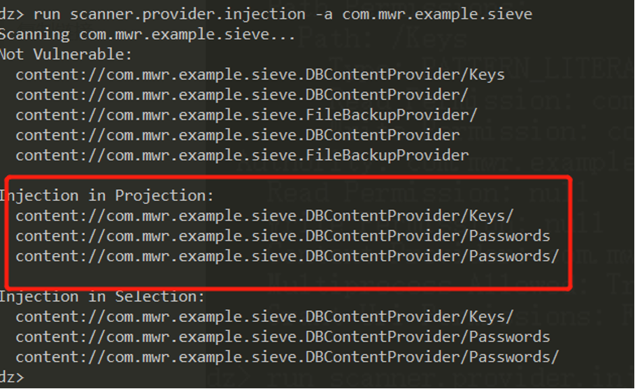 run scanner.provider.injection -a com.mwr.example.sieve