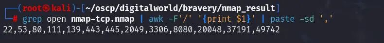 grep open nmap-tcp.nmap | awk -F'/' '{print $1}' | paste -sd ','