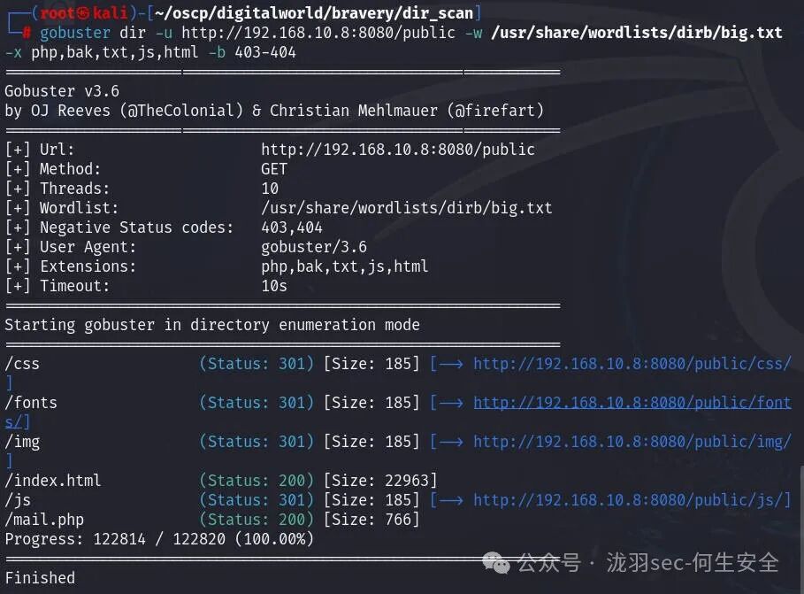 gobuster dir -u http://192.168.10.8:8080/public -w /usr/share/wordlists/dirb/big.txt -x php,bak,txt,js,html -b 403-404