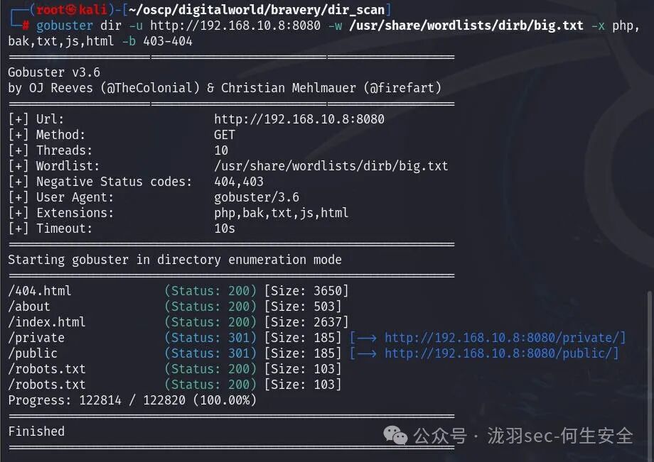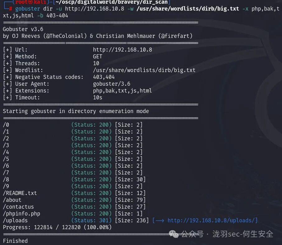 gobuster dir -u http://192.168.10.8 -w /usr/share/wordlists/dirb/big.txt -x php,bak,txt,js,html -b 403-404