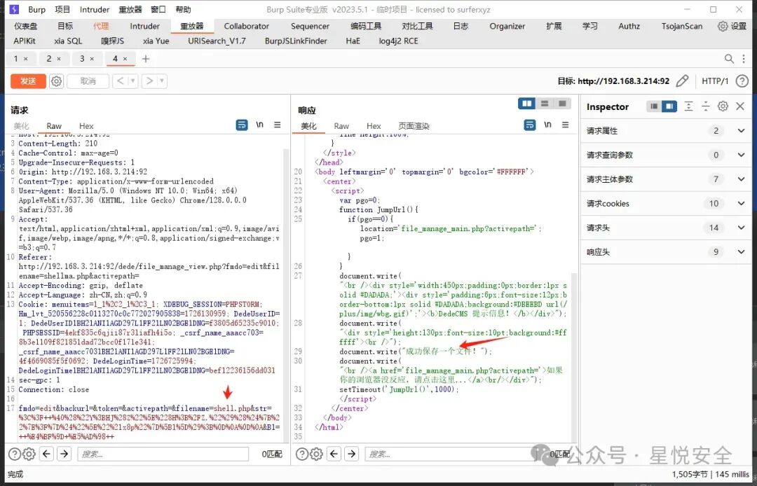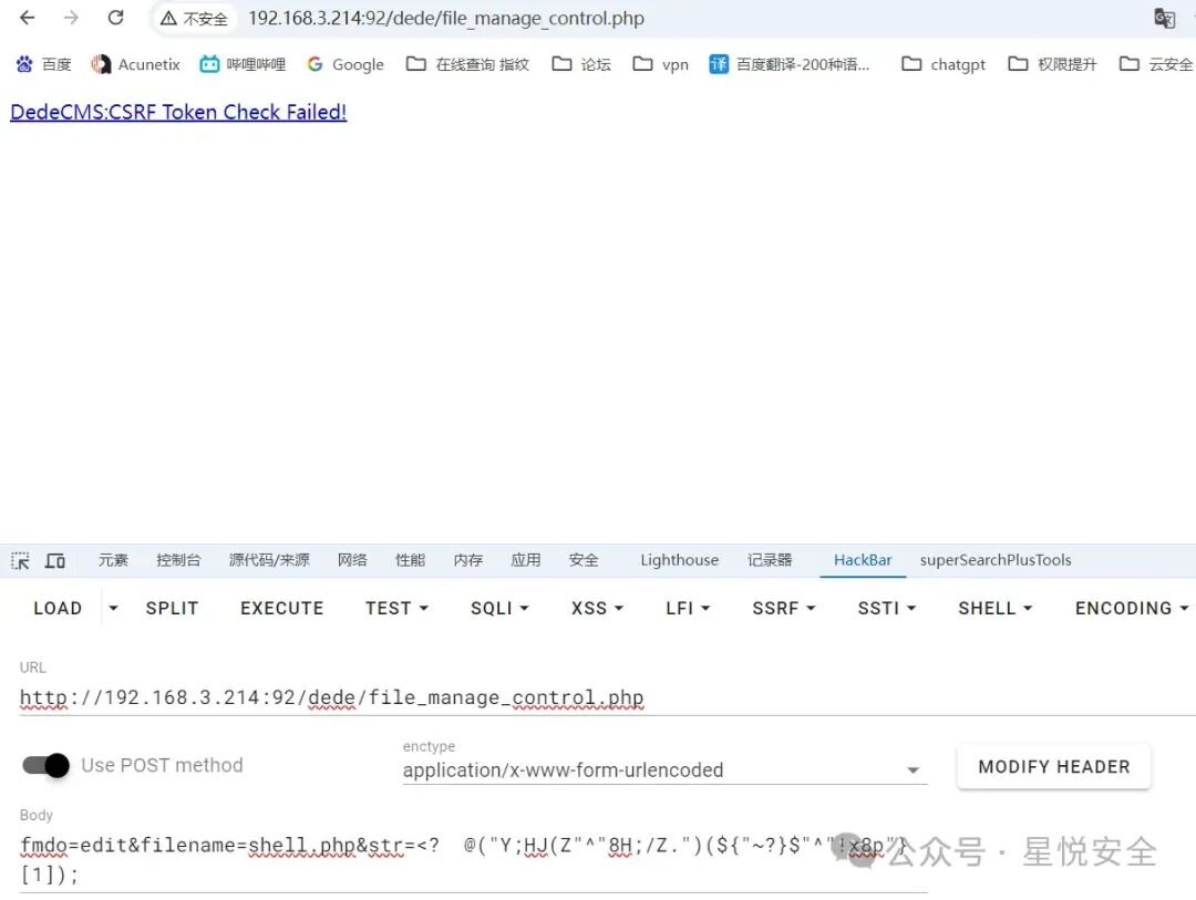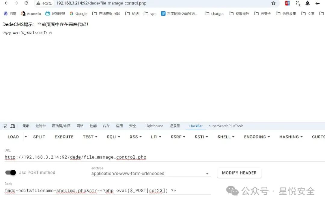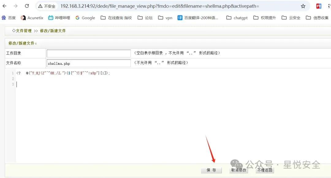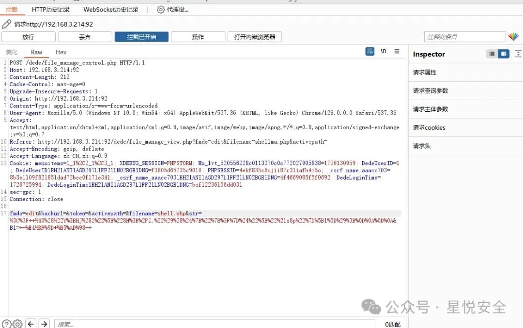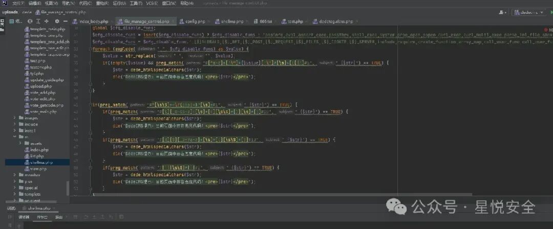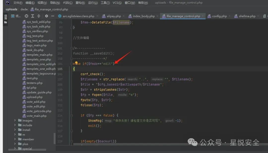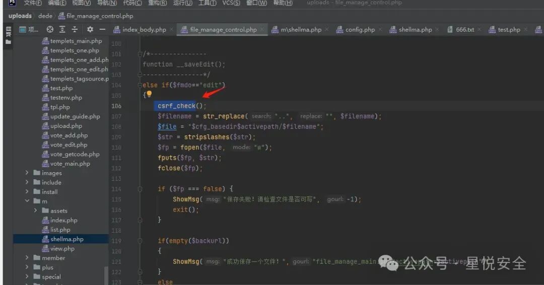 该漏洞点位于dede/file_manage_control.php 参数str过滤不完善导致的,可以看到当fmdo=edit执行此代码,Filename跟str均可控