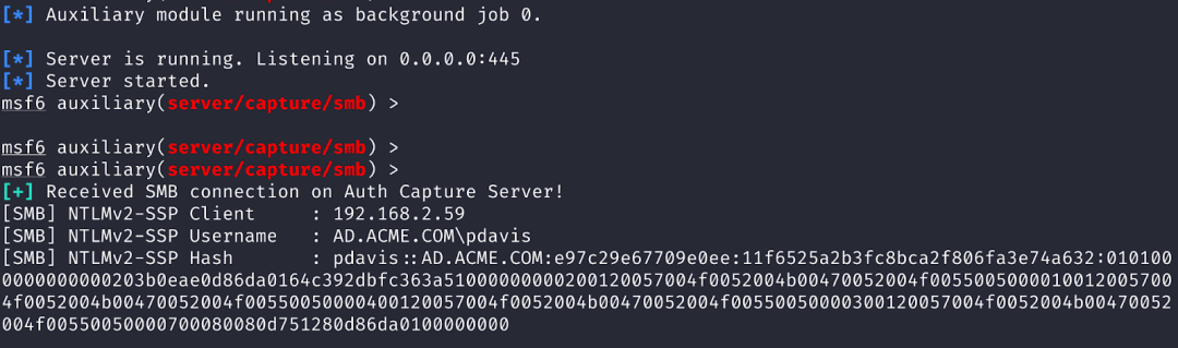 Metasploit 的辅助/服务器/捕获/smb 模块可以收集 NetNTLMv2 挑战,然后攻击者可以离线破解它或将其中继到加入域的系统。