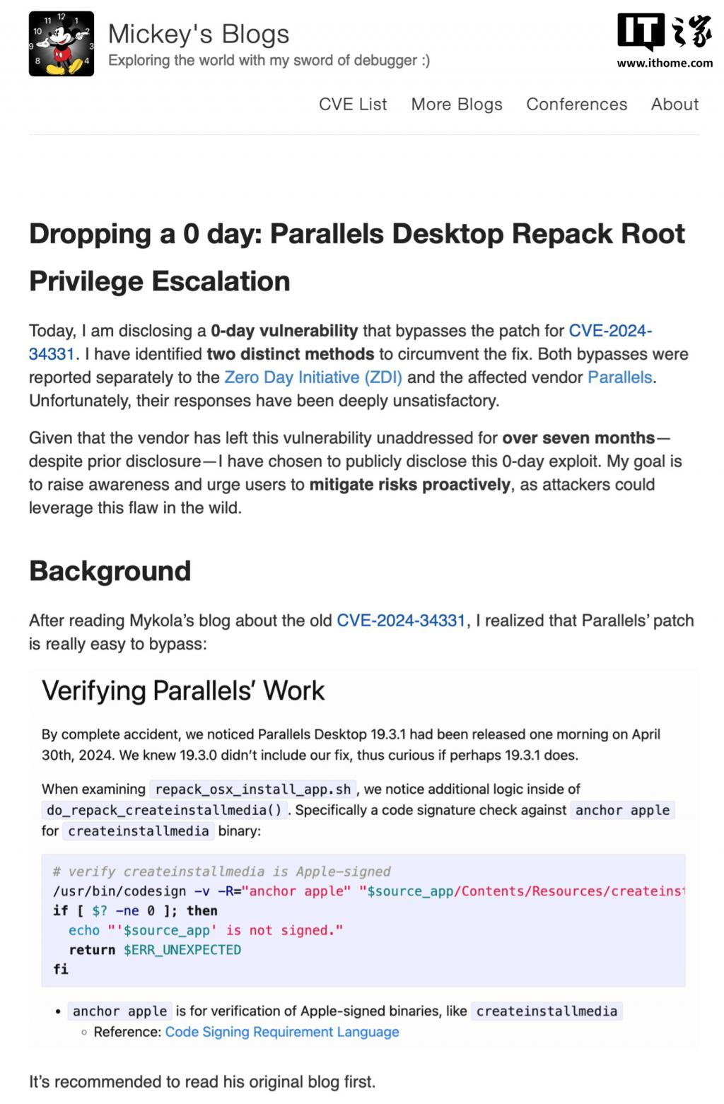 IT 之家注意到,Mickey Jin 先后向漏洞悬赏项目 Zero Day Initiative(ZDI)以及 Parallels 报告此事,但时隔半年该漏洞依然未能彻底修复,因此他决定公开披露相应漏洞,并呼吁用户提高警惕。