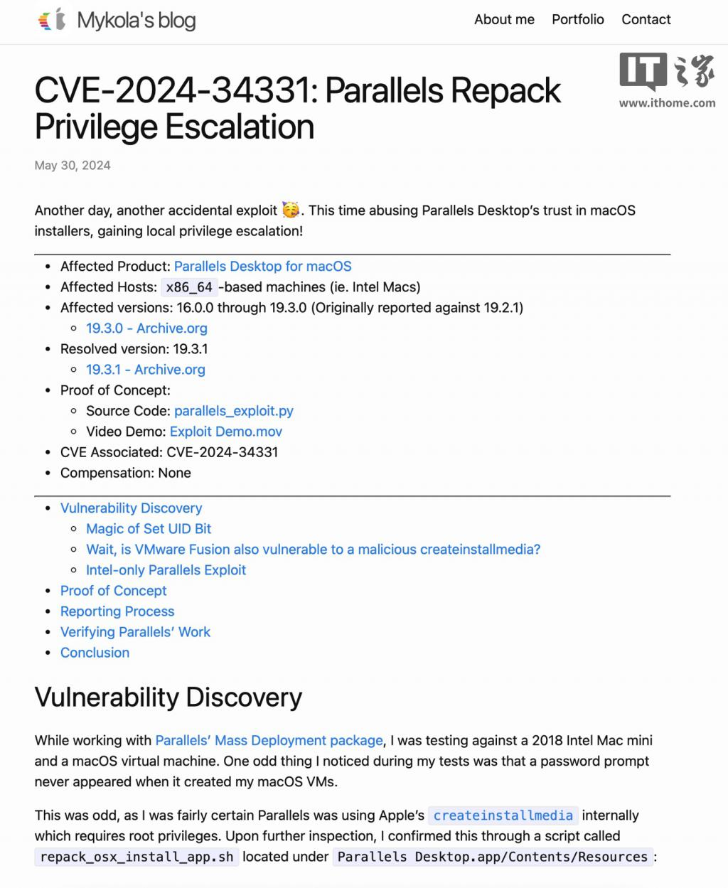安全研究员 Mykola Grymalyuk 去年曝光苹果 macOS 平台广受好评的 Parallels Desktop 虚拟机软件存在一项编号为 CVE-2024-34331 的提权漏洞。