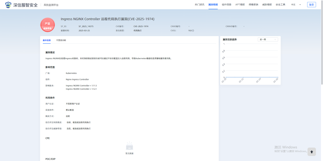 2025年3月27日,深瞳漏洞实验室监测到一则Nginx Ingress Controller组件存在代码执行漏洞的信息,漏洞编号:CVE-2025-1974,漏洞威胁等级:严重。