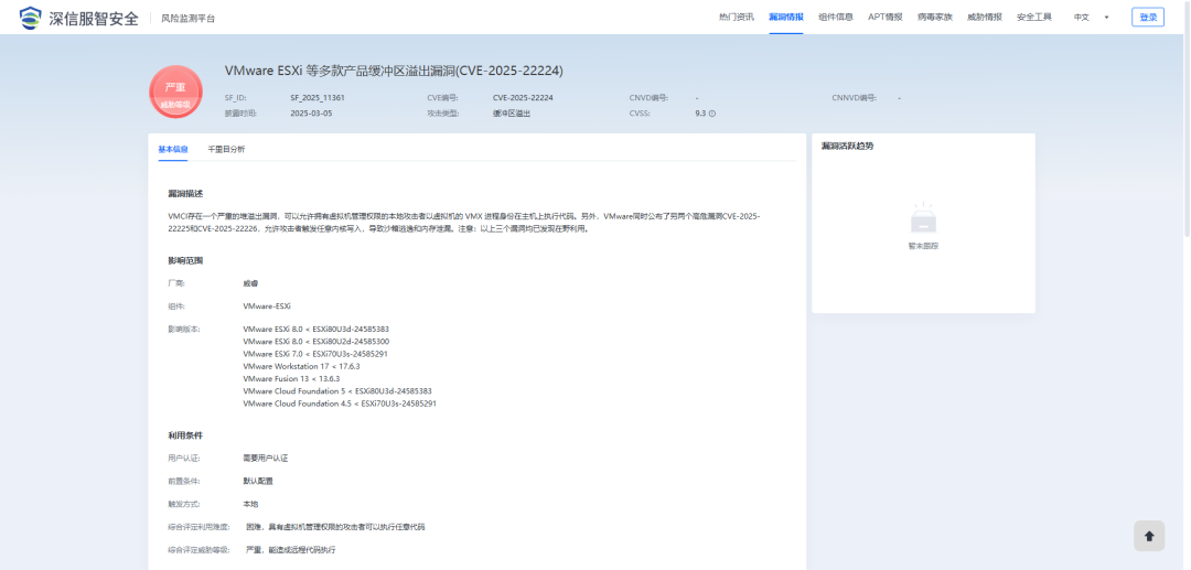 2025年3月5日,深瞳漏洞实验室监测到一则VMware-ESXi等多组件存在缓冲区溢出漏洞的信息,漏洞编号:CVE-2025-22224,漏洞威胁等级:严重。