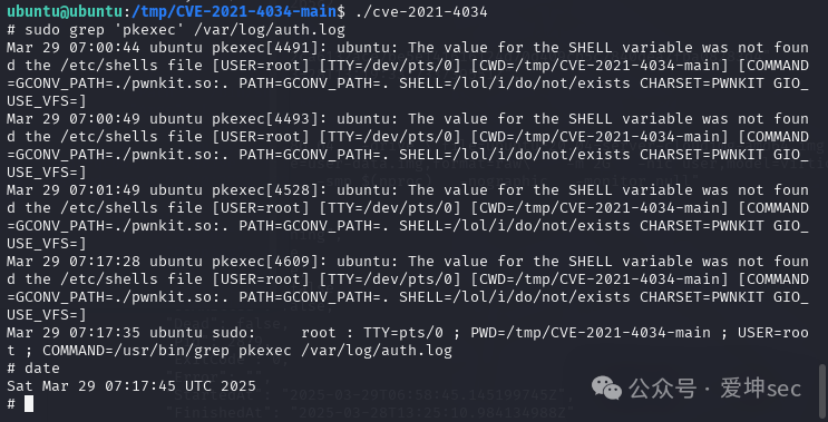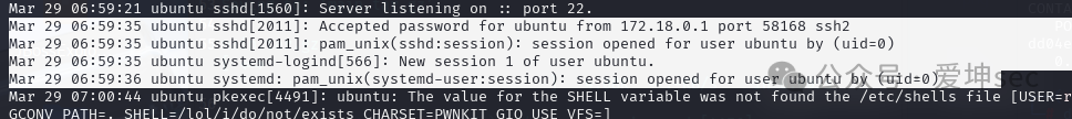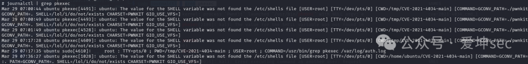 Mar 29 07:00:44 ubuntu pkexec[4491]: ubuntu: The value for the SHELL variable was not found the /etc/shells file [USER=root] [TTY=/dev/pts/0] [CWD=/tmp/CVE-2021-4034-main] [COMMAND=GCONV_PATH=./pwnkit.so:. PATH=GCONV_PATH=. SHELL=/lol/i/do/not/exists CHARSET=PWNKIT GIO_USE_VFS=]
