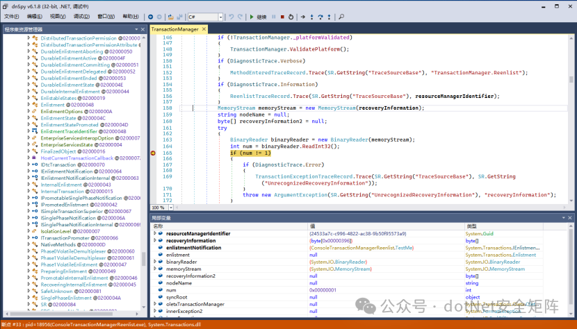 在 TransactionManager.Reenlist 方法内部,核心处理逻辑如下,首先创建 MemoryStream:该方法首先使用 MemoryStream 读取传入的二进制数据,随后,从流中读取一个 32 位整数(int num),并检查其值是否为 1。如果不满足,则不会进入后续处理逻辑。