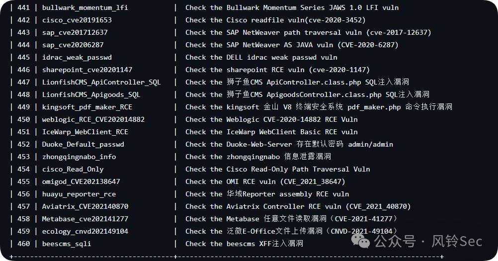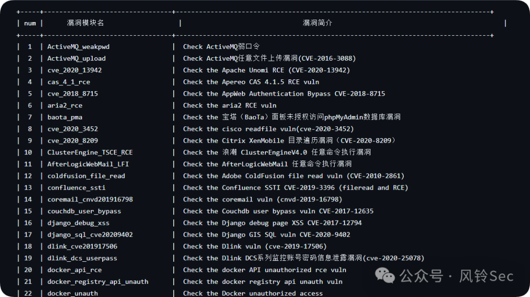 称:Find-Vulnerability)主要适用于日常安全服务、渗透测试人员和RedTeam红队人员,它集合的功能包括:存活IP探测、开放端口探测、web服务探测、web漏洞扫描、smb爆破、ssh爆破、