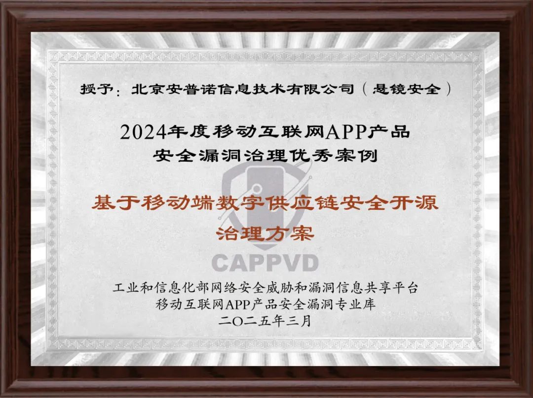 2025年3月13日,由中国软件评测中心、CAPPVD漏洞库联合主办的“第六期移动互联网APP产品安全漏洞技术沙龙”在海口成功召开。悬镜安全基于移动端数字供应链安全开源治理方案荣获中国软件评测中心“2024移动互联网APP产品安全漏洞治理”十大优秀案例,并获颁证书。