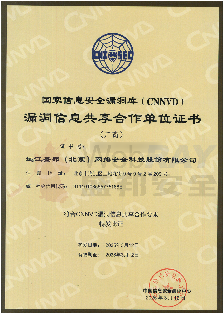 近日,盛邦安全获得了由国家信息安全漏洞库(CNNVD)颁发的“CNNVD漏洞信息共享合作单位”证书,公司在漏洞发现与治理方面的专业能力和综合实力再次获得国家级平台的重要认可。