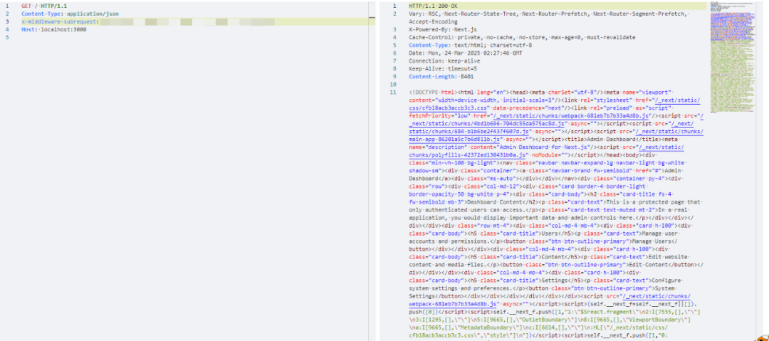 当在 next.js应用中使用middleware 时,在请求头中加入特定的 x-middleware-subrequest 请求头即可绕过 middleware 中的逻辑。例如当使用 middleware 进行身份验证与授权,可利用该漏洞绕过身份验证。