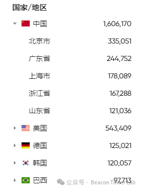 据daydaymap数据显示互联网存在3,448,107 个资产,国内风险资产分布情况如下,主要分布在国内。