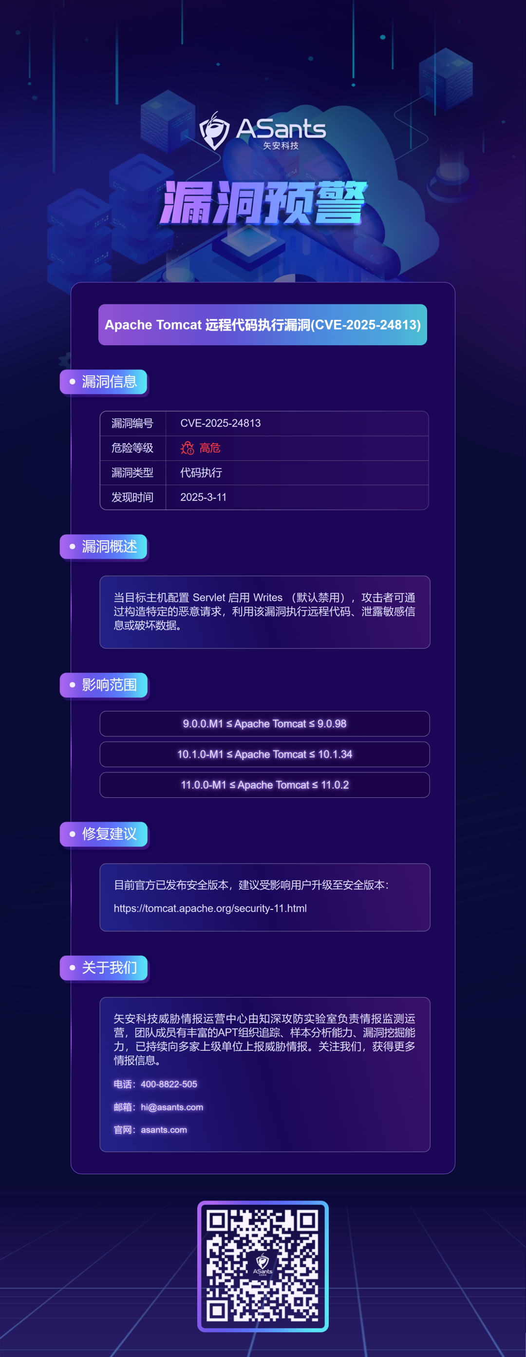 漏洞预警|Apache Tomcat 远程代码执行漏洞(CVE-2025-24813) 发布于2025年3月12日2025年7月19日 作者:cve-20 漏洞预警|Apache Tomcat 远程代码执行漏洞(CVE-2025-24813) 威胁情报运营中心 矢安科技 2025-03-11 19:14