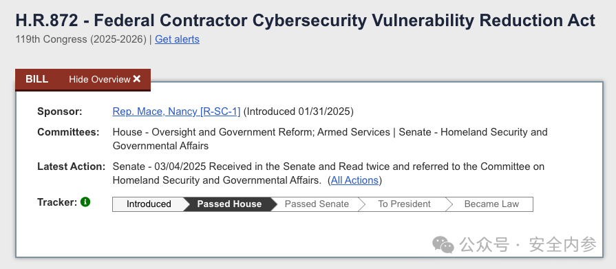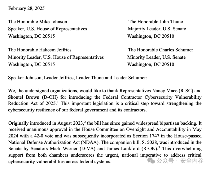 HackerOne、Bugcrowd、微软、Infoblox、Rapid7、趋势科技、Tenable以及施耐德电气在信中表示:“联邦承包商处理着大量敏感数据,因此成为网络攻击的主要目标。该法案将确保所有与联邦政府合作的供应商遵循安全最佳实践,从而提升整体安全态势。”信中进一步指出:“该法案是在现有政策的基础上,进一步推动漏洞披露政策的普及,鼓励安全研究人员和企业主动发现并报告漏洞,以降低关键系统遭受攻击的风险。”该法案最早由共和党众议员Nancy Mace于2023年提出,并经过两年的推动逐步获得通过。2024年,民主党参议员Mark R. Warner和共和党参议员James Lankford在参议院提出了对应版本,以加快立法进程。2024年5月,该法案获得众议院监督与问责委员会批准,随后被纳入《国防授权法案》。目前,该法案已送交参议院,并移交至国土安全与政府事务委员会审议。